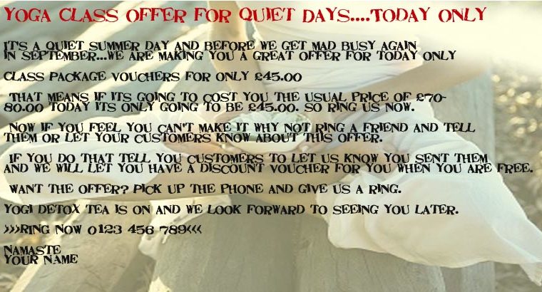 Posted onQuiet days in the yoga studio? No problem, we’ve all been there… Here is a way to get more students in your yoga class today Modify this yoga studio advertising script template according to your needs Happy Studio Advertising Namaste Tamara Machavariani Get more ideas about studio advertising and how to get more students in the class today CLICK HERE